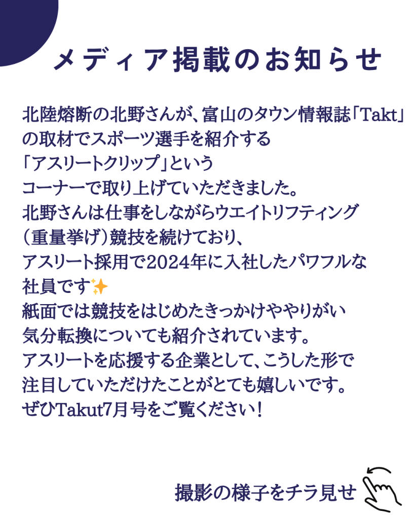 ウエイトリフティング競技と仕事を両立する北陸熔断㈱の北野さんが取材を受けました!